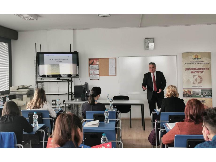 NSI President Assoc. Prof. Atanas Atanasov, PhD, was a lecturer in a training workshop on Economic Diplomacy, which was held at the Diplomatic Institute of the Ministry of Foreign Affairs. The topic of the presentation was "NSI - how to read the numbers". For one hour, Assoc. Prof. Atanasov presented the activities of NSI, the basic principles of statistics, the ways and channels of dissemination of statistical data, the main information systems of NSI, errors made when reading the information and others.