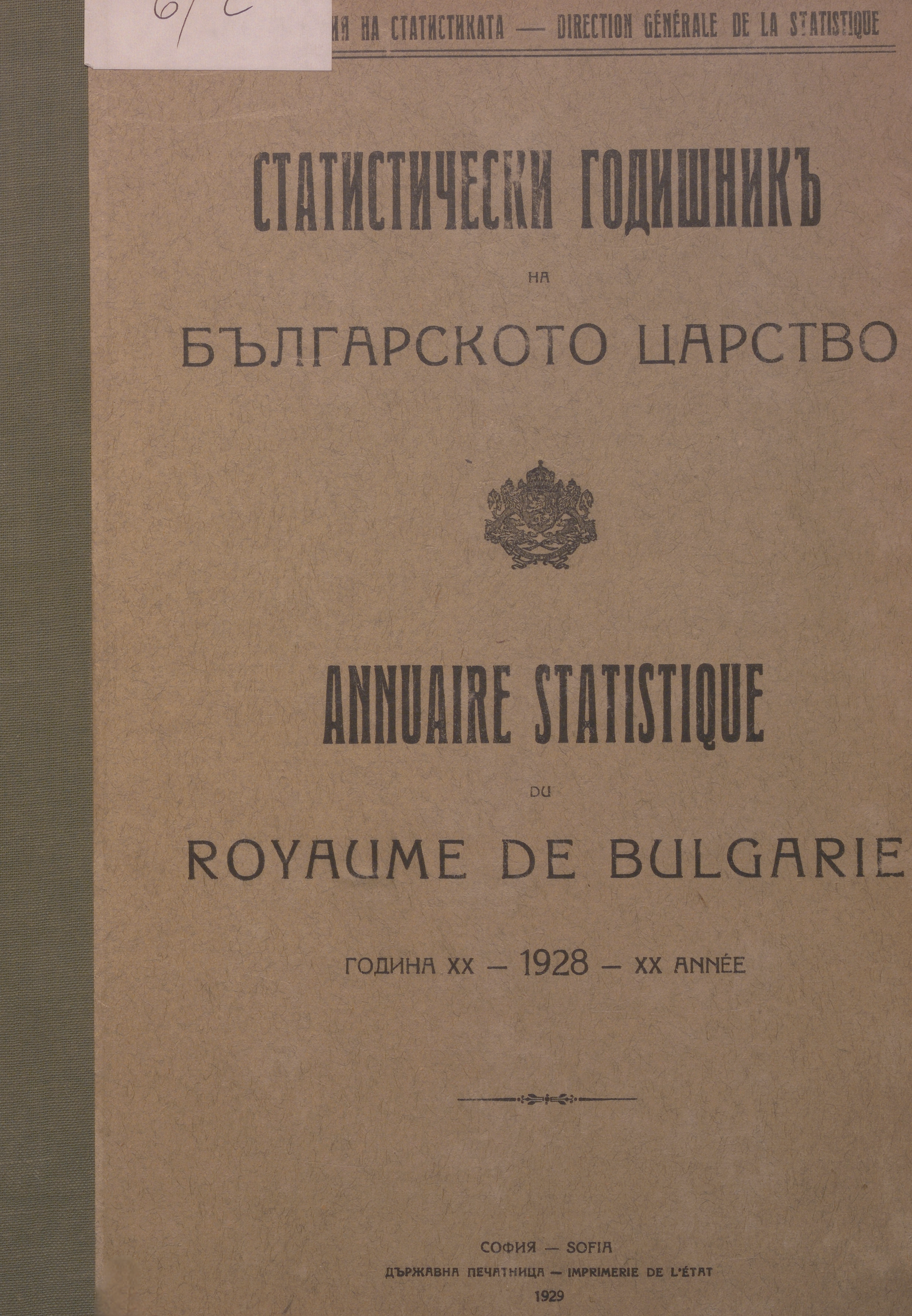 The twentieth edition of the Statistical Yearbook of the Bulgarian Kingdom for 1928 is available for the web users. The publication came out of print in 1929 and is structured in XXI sections on the principle of the previous statistical yearbooks, without an international review included. The publication contains the overall results of the 1926 census of population and housing. Domestic animals, poultry, vehicles, agricultural implements and machinery in the Kingdom are also counted. The results of the 1927/1928 centenarian survey are also published in this edition. The data relate to centenarians by municipality, district, sex, age and nationality, family status and occupation. The statistical yearbook consists of 502 pages and is in Bulgarian and French.