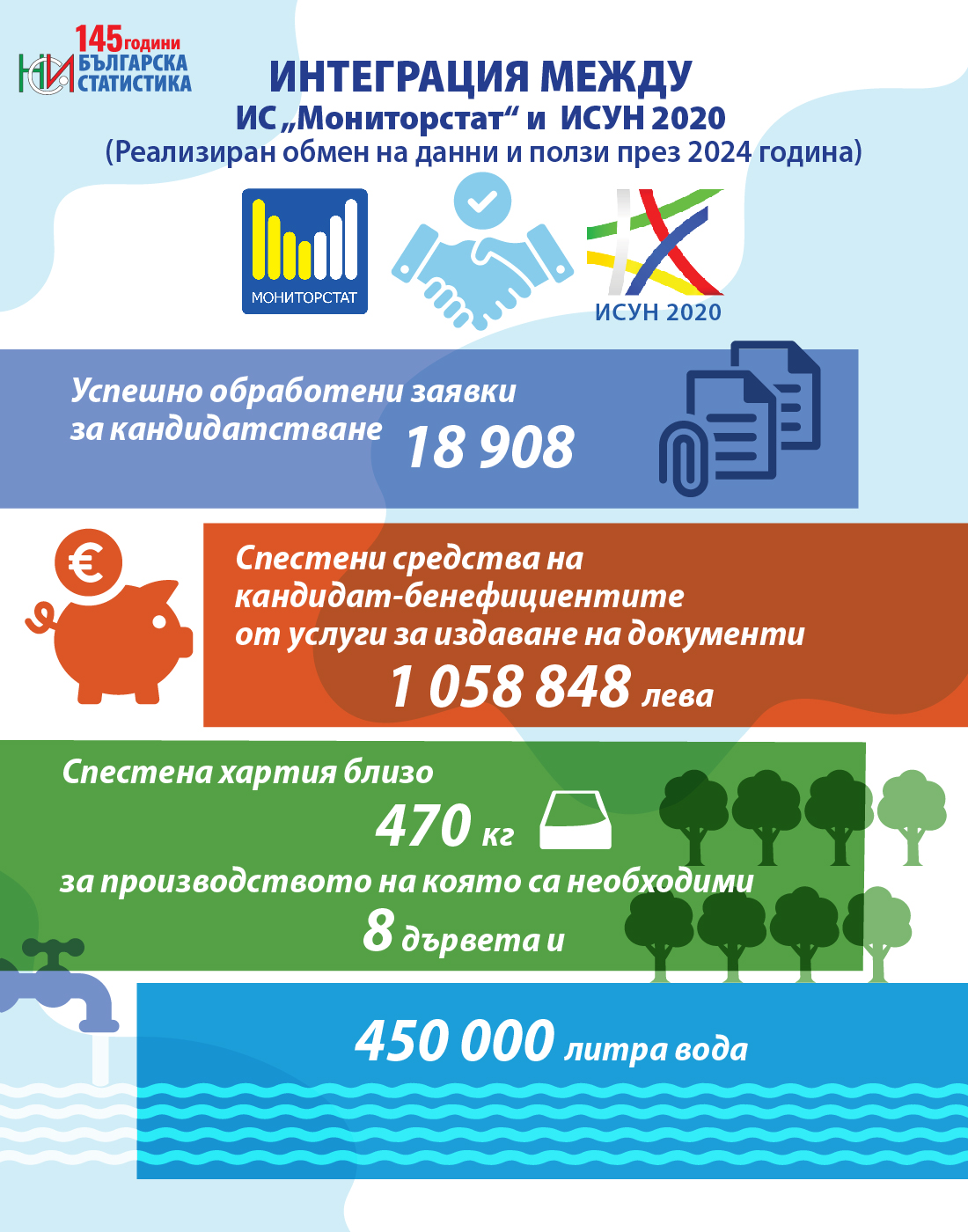 Информационната система „Мониторстат“ на Националния статистически институт е уеббазирана система, която позволява достъп до индикатори и метаданни от статистически изследвания за национални, европейски и международни стратегии и оперативните програми на ЕС. През 2020 г. беше осъществена интеграция между „Мониторстат“ и ИСУН 2020, която дава възможност за автоматично изтегляне на данни, свързани с дейността на кандидатите, подаващи проектни предложения. По този начин се намалява административната тежест за кандидатите по процедурите за подбор на проектни предложения.