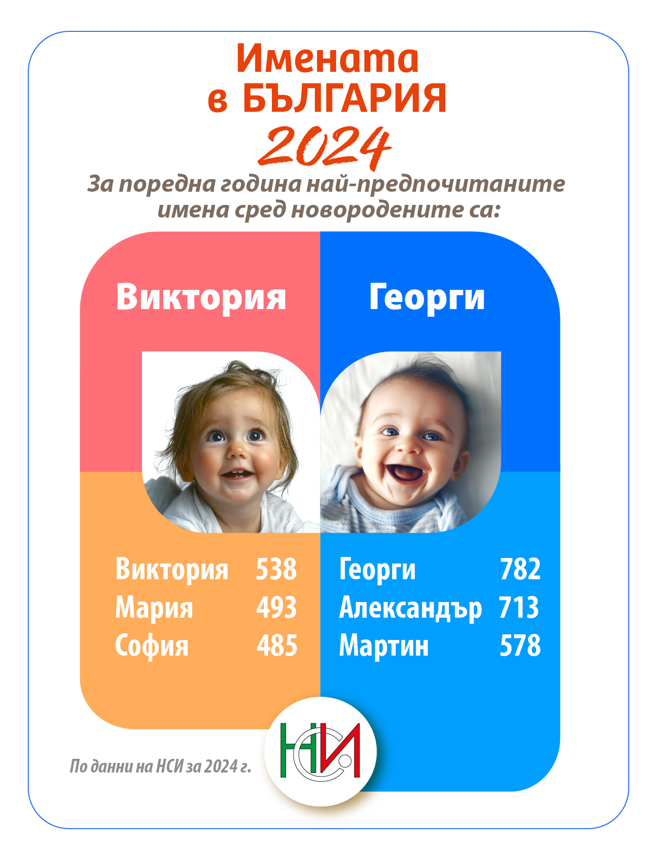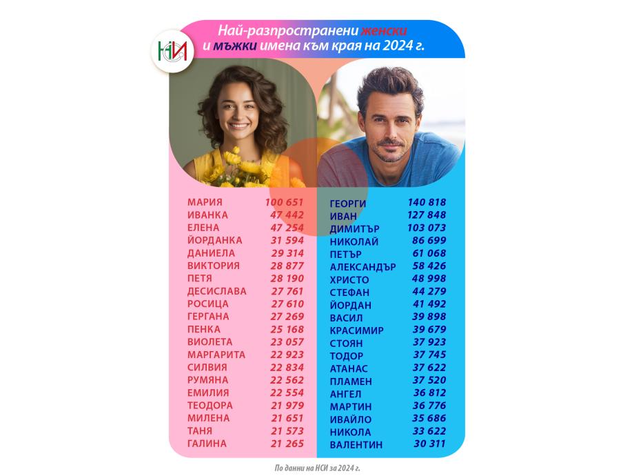 През 2024 година най-често срещаните имена в България при мъжете и жените са Георги (141 хил.) и Мария (100 хил.). След тях остават Иван и Иванка.