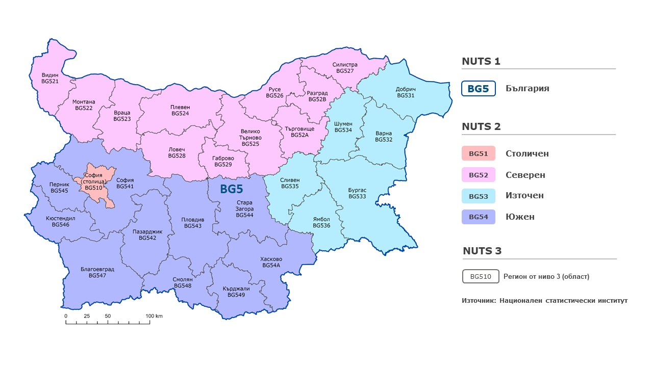 Актуалната версия на класификацията е приета с делегиран регламент (ЕС) 2026/195 на Комисията от 13 ноември 2025 г., а в частта ѝ за България е утвърдена със Заповед № РД-05-111/18.02.2026 г. на председателя на НСИ. Съгласно нея територията на цялата страна формира един регион от ниво 1 на NUTS, който се подразделя на четири региона от ниво 2 (NUTS 2) и 28 региона от ниво 3 (NUTS 3).