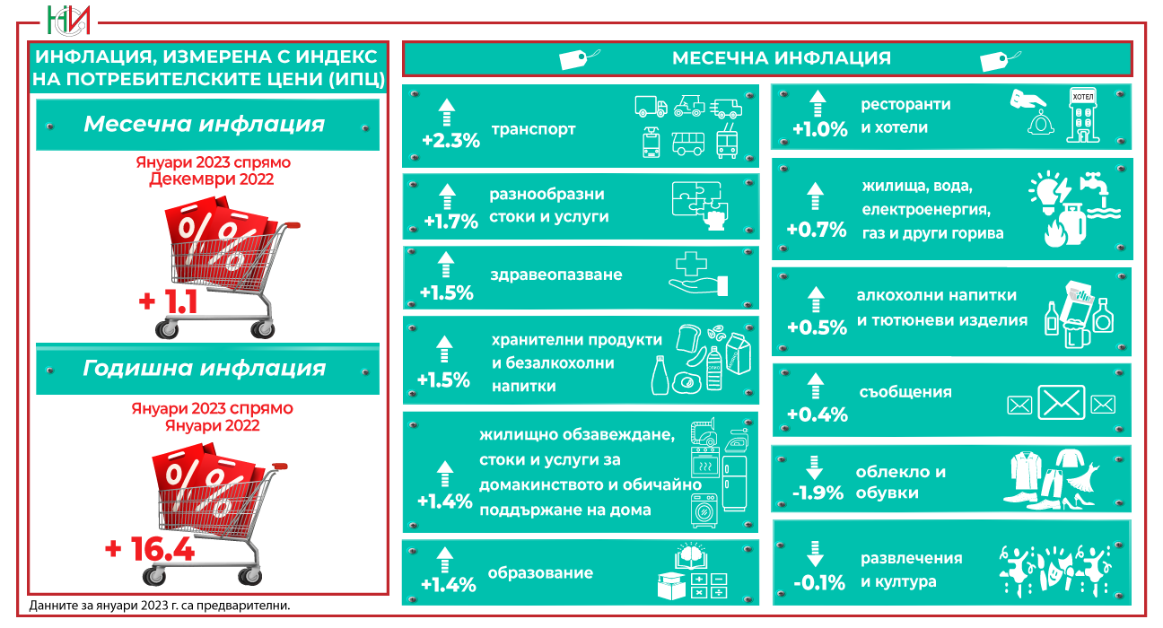 По предварителни данни на НСИ, през януари 2023 г. месечната инфлация, измерена с индекса на потребителските цени (ИПЦ), е 1.1% спрямо предходния месец, а годишната инфлация за януари 2023 г. спрямо януари 2022 г. е 16.4%.