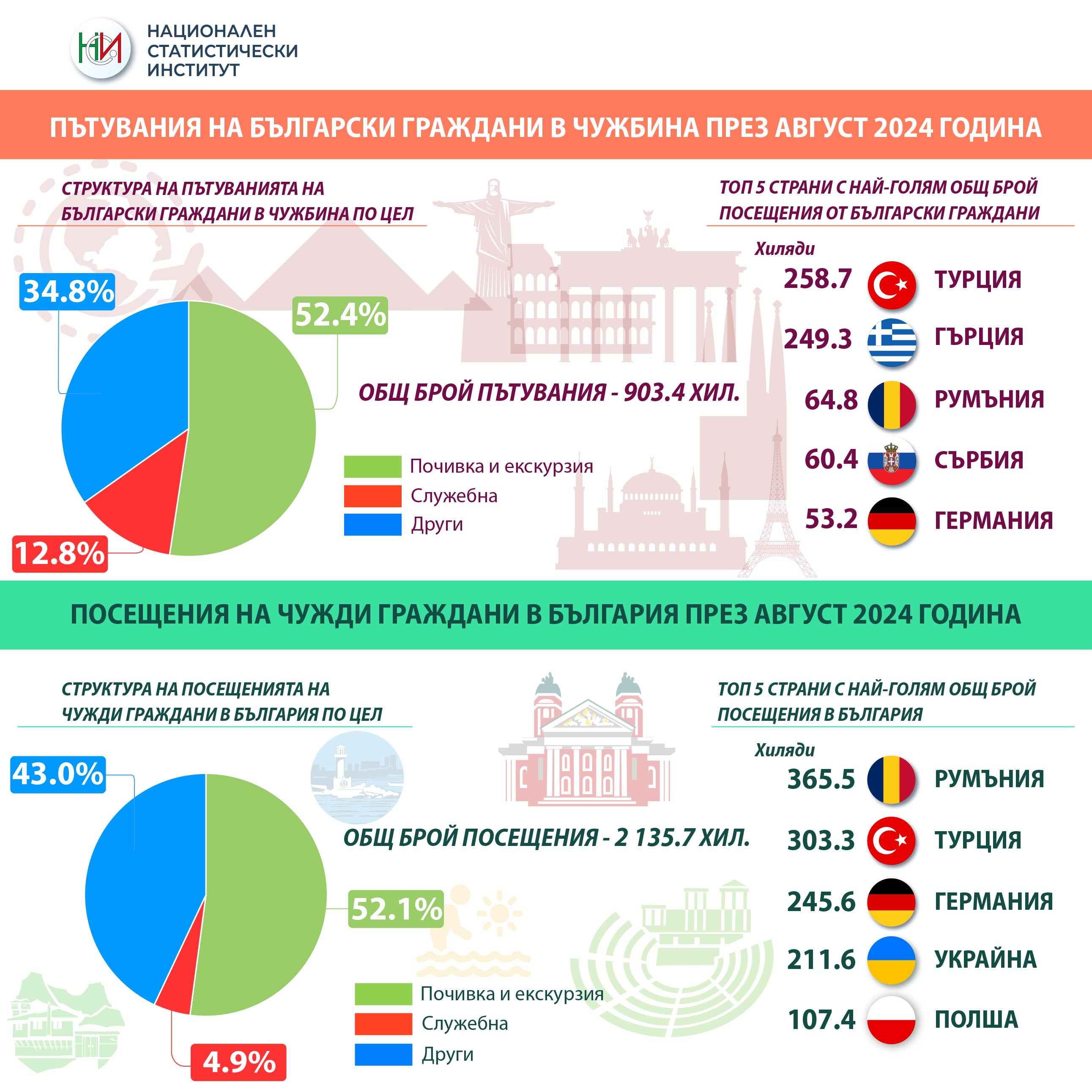 Пътуванията на български граждани в чужбина през август 2024 г. са 903.4 хил., или с 8.3% повече от август 2023 година. Регистрирано е увеличение на пътуванията с цел почивка и екскурзия - с 19.6% и със служебна цел - с 3.0%, докато тези с други цели (гостуване, обучение, посещение на културни и спортни мероприятия) намаляват с 3.6%. Посещенията на чужди граждани в България са 2 135.7 хил., или с 2.8% повече в сравнение със същия месец на предходната година. Регистрирано е увеличение на пътуванията с цел почивка и екскурзия с 6.2%, докато тези със служебна цел и с други цели намаляват съответно с 2.3 и 0.5%.