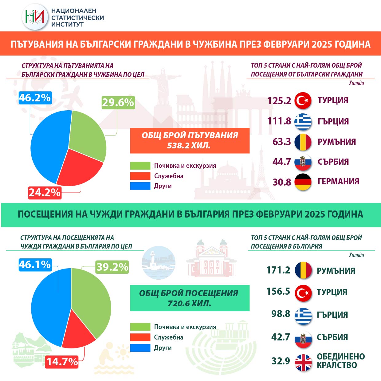 | Описание на данните | Пътувания на български граждани в чужбина по цел на пътуването и по страни, посещения на чужди граждани в България по цели на пътуването и по страни. |