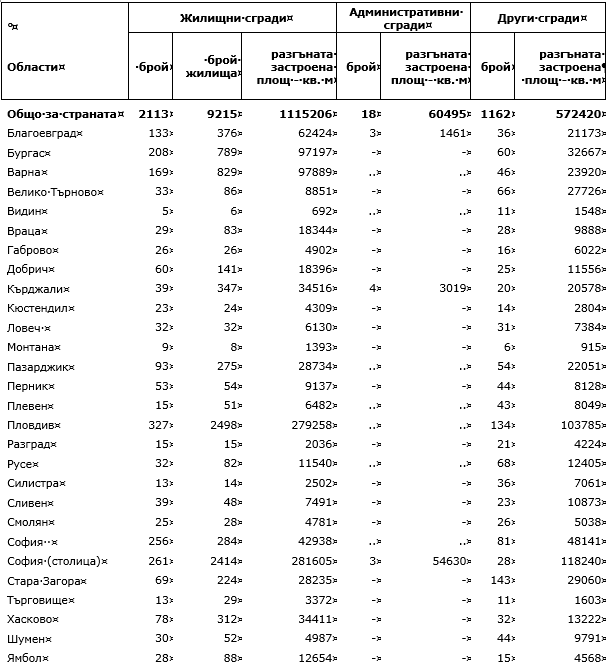 | Източници на данни | Информацията се агрегира от посочените данни в „Отчет за разрешеното и започнато строителство на нови сгради“. Източник на данни са строителните книжа в техническите служби на общините. |